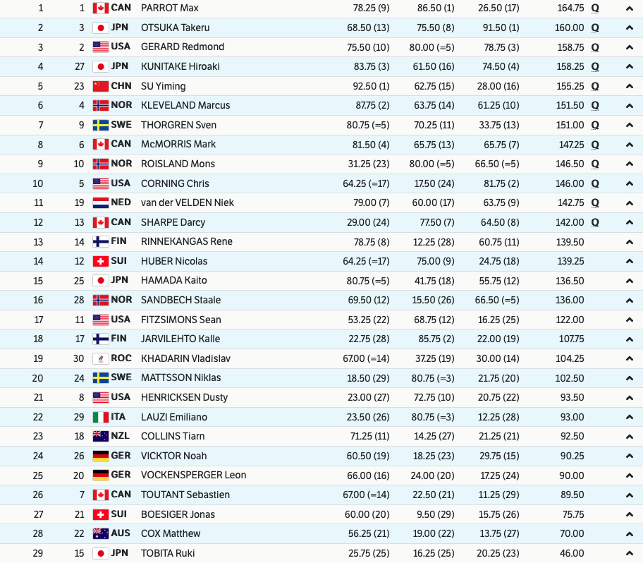 Vinneren av slopestyle, Max Parrot, ble også best i dagens kvalifisering, med cab 1620 og frontside 1620. Triks vi vet at både Marcus og Mons kan matche i finalen kl 06:00 i morgen tidlig.