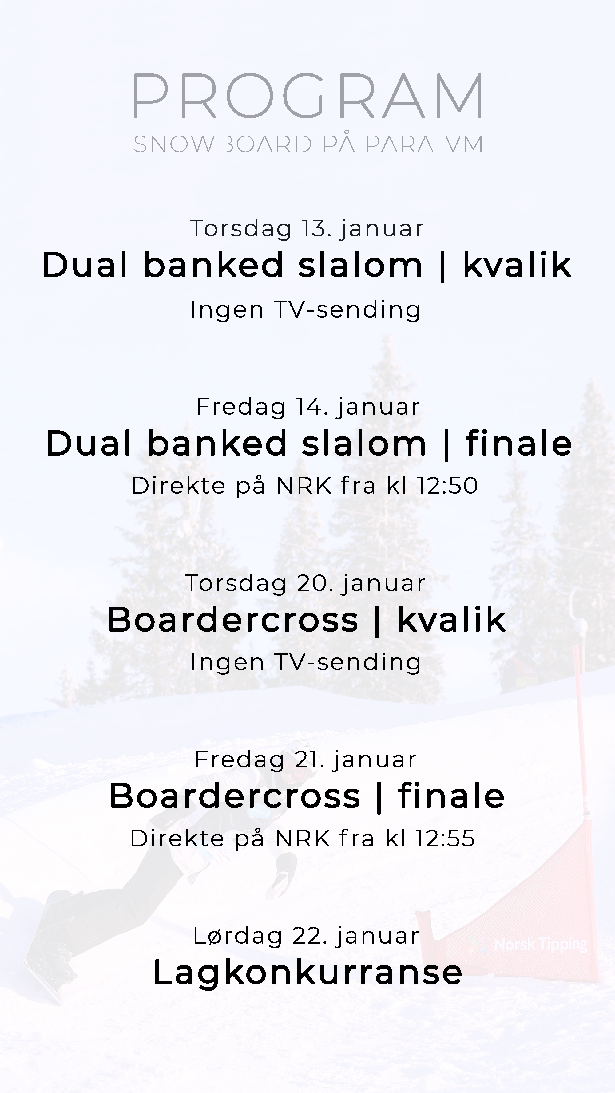 På grunn av smittesituasjonen blir mesterskapet uten publikum, men det blir likevel muligheter til å følge det historiske arrangementet gjennom NRK. Første sending starter allerede torsdag 13. januar med utfor og langrenn. Kvalifiseringen i banked slalom sendes dessverre ikke på TV, så følg med i brettforbundets instagram-konto.